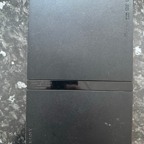 Sony Playstation 2 Slim spillkonsoll i svart. Konsollen er den slanke varianten av PS2 med frontmonterte USB-porter og minnekortspor. Medfølgende utstyr på bildene inkluderer strømforsyning (AC-adapter 8,5V) og AV-kabel med komposittkontakter (gul, rød, hvit) for tilkobling til TV. Egnet for avspilling av Playstation 2-spill og DVD-filmer, for én eller flere spillere avhengig av spill og ekstra kontrollere.