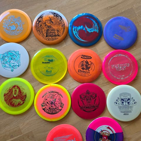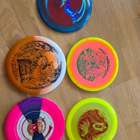 Har ti stykk discer for frisbeegolf som ikke brukes mer. De gule og blå er enkle, nybegynnerdiscer. Fungerer utmerket til hobbybruk. De fem andre er mer rettet mot aktiv bruk. Se bilder for fart, glide, turn og kompensasjon/fade.