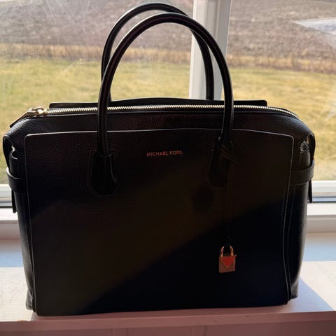 Ubetydelig brukt veske i lær med lengde 33 cm, høyde 33 cm og dybde i bunn ca 15 cm