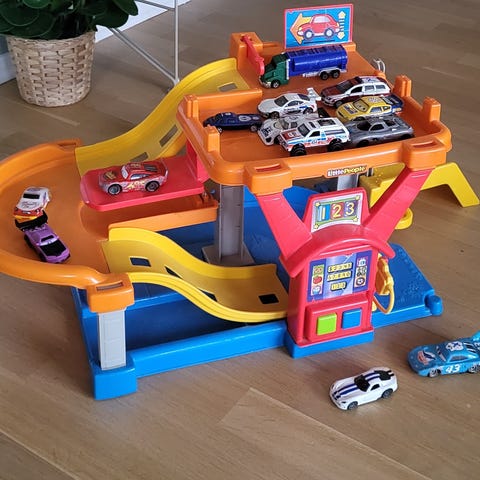 Mangler noen gjerder men har ikke så mye å si for leken. Veldig morsomt med heisen som kan heise opp biler og som øver finmotorikken