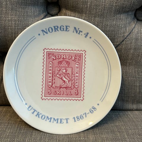 PORSGRUND PORSELEN SAMLE PLATTER. LAVT OPPLAG. NORSKE FRIMERKER, OSCAR II, 1878. MED BILDE AV FRIMERKE 1,50 KRONER. TROLIG UTGITT PÅ 1970-TALLET.