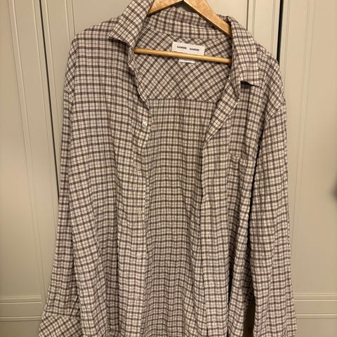 Samsøe Samsøe skjorte for herre i størrelse XXL. Skjorten er laget i lin og har beige bunnfarge med vertikale striper.