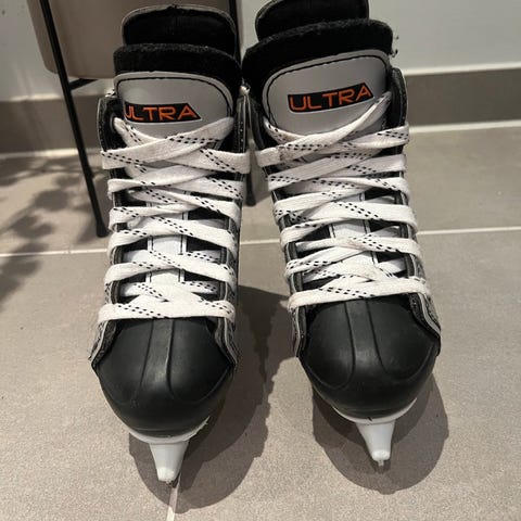 Powerline ishockeyskøyter i svart med hvite lisser. Skøytene har polstret ankelparti og forsterkede sider for støtte under bruk på is. Bladene er i metall og egnet for ishockey. Passer til bruk på isbaner til trening eller fritidsbruk.