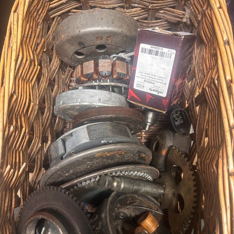Scooter som demontert/deleobjekt. Flere deler synlig, blant annet karosserideler, hjul og styre. Egnet som reservedeler eller prosjekt for den som trenger komponenter til tilsvarende type scooter. Tilstand og funksjon på de enkelte delene er ukjent, og kjøper må påregne reparasjon eller bruk som delelager.