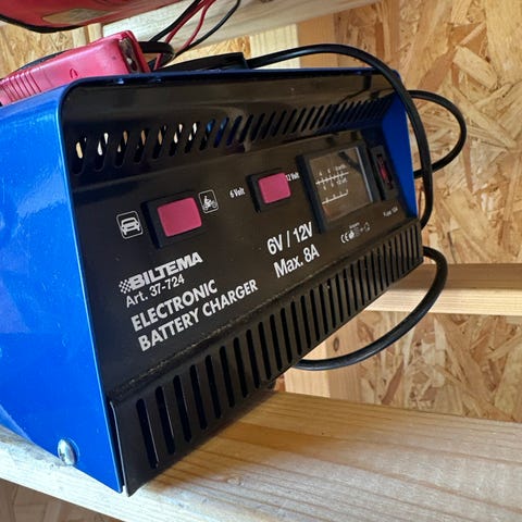 Biltema 37-720 elektronisk batterilader for 12V batterier med ladestrøm opptil 5A. Enheten har analog måler for ladestrøm på fronten og tilkoblingskabler med klemmer. Passer til lading av 12V blybatterier, for eksempel i bil, båt eller andre kjøretøy og maskiner som benytter 12V batteri. Leveres i blå utførelse med bærehåndtak på toppen.