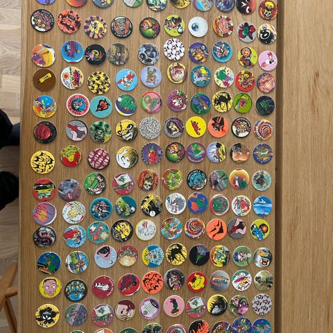 SkyCaps samling med superheltemotiv. Brikkene har trykk med ulike tegneseriefigurer på forsiden og SkyCaps-logo på baksiden. Egner seg som samleobjekter eller til spill og lek.