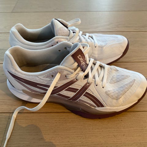 Asics tennissko i hvit med lilla detaljer i størrelse 39,5 (25,0 cm). Skoene har snøring og yttersåle med mønster tilpasset racket- eller innendørssport. Overdelen er i syntetisk materiale med perforeringer for ventilasjon, og polstret hæl og pløse for økt komfort. Passer til bruk på tennisbane eller annen hallidrett der det trengs stabile og gripefaste sko.