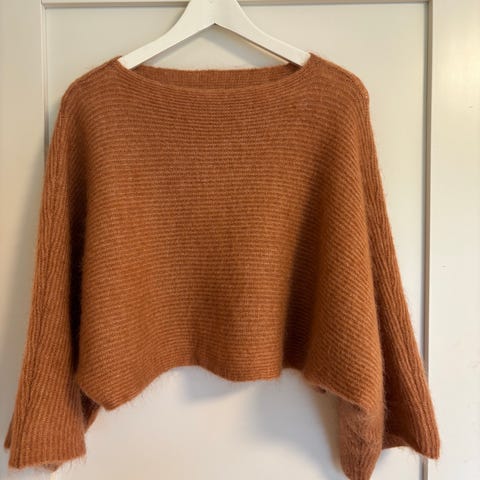 Pent strikket genser ( ikke av meg) i ull. Sennepsgul delikat farge. Modellen er litt kortere foran enn bak, med liten splitt i sidene. Passer fint til meg som er en str M/medium.