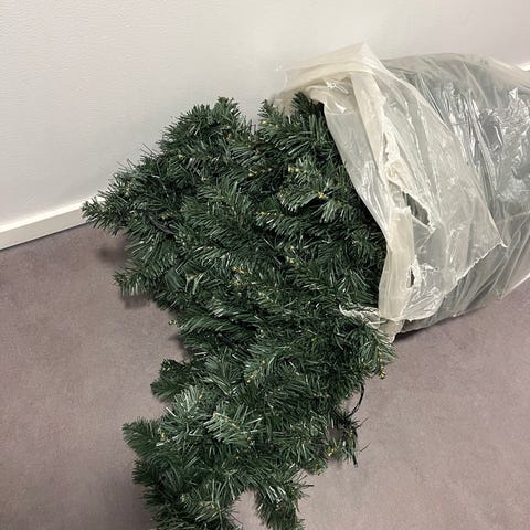 Kunstig juletre 210 cm høyt, fra Plantasjen til innendørs bruk gis bort (uten julepynt).