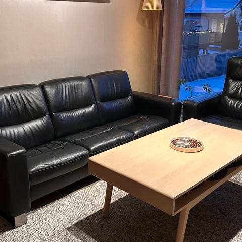 Sofasett i svart skinn bestående av en 2-seter og en 3-seter sofa. Sofaene har rette linjer og lave armlener. Understell med lave ben. Passer til stue eller TV-stue der det er behov for flere sitteplasser. Puter kan følge med. Bord og salongteppe ligger ute i annen annonse.