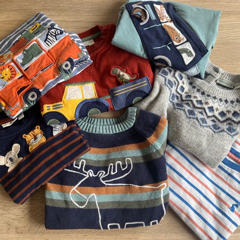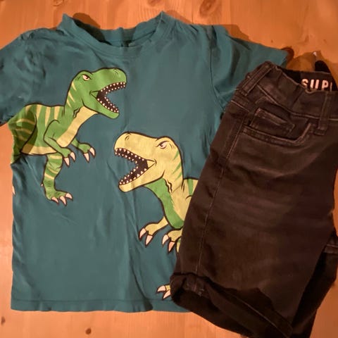 Klespakke med tre plagg. Fruit of the Loom t-skjorte for gutt i størrelse 116. T-skjorten er blå og har motiv av isbjørn og teksten «Svalbard» på fremsiden. Langermet blå genser fra c , pent brukt og én pysjbukse ( litt løs i strikket i livet) T-skjorta passer til hverdagsbruk, under genser eller som del av et lag-på-lag antrekk for barn i aktuell høyde og alder.