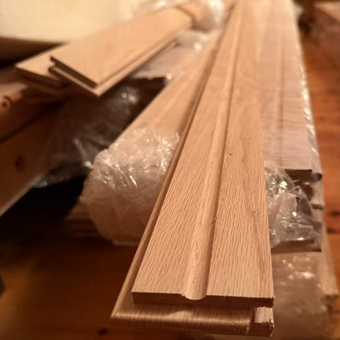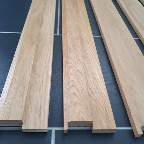 15 stykk trinn og stusstrinn av ask, trinn er 4,1 cm tykk og stusstinn er 2 cm, lengste er 152 cm lang og minste er 1 meter lang.