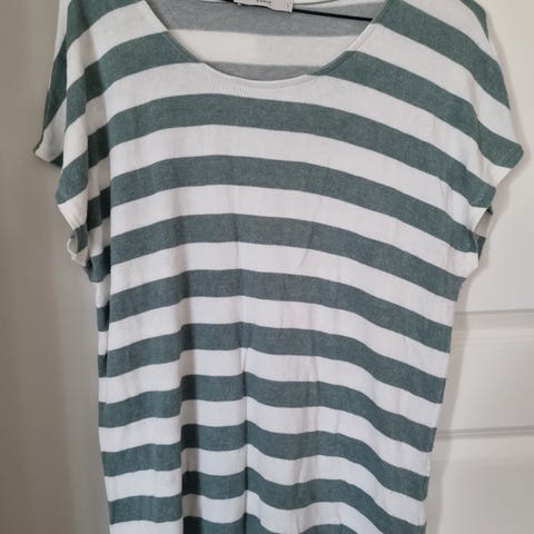Pent brukt hvit topp med svarte tynne striper. Toppen rekker meg ca til bukselinninga, jeg er mellom 1.75 og 1.76 høy. Den har type korte ermer som en t-skjorte. Bak i nakken er det en liten oval åpning med en knapp øverst som en morsom detalj. stoffet er lett og luftig og passformen er noe ettersittende.