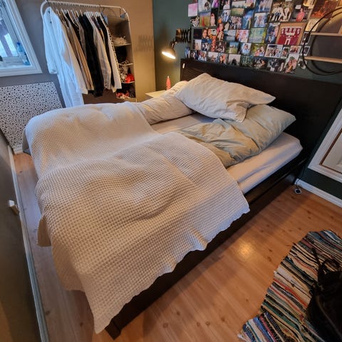 IKEA sengegavl trukket i grått tekstil. Rektangulær modell med polstret front og avrundede kanter. Baksiden har enkel treramme. Passer som gavl bak seng, montert mot vegg.