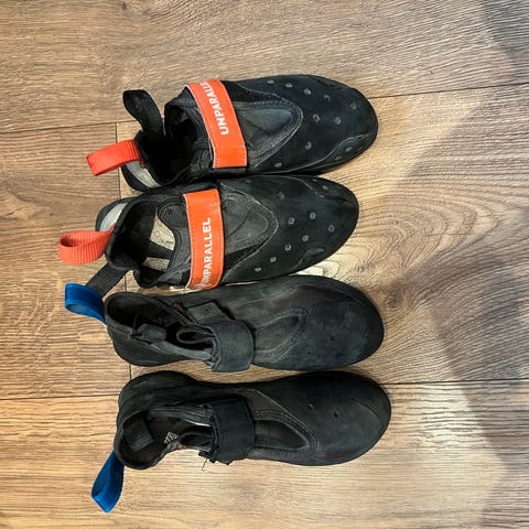 Brukte Unparallel Souped Up buldresko / klatresko. Bra sko som jeg dessverre måtte innse at ikke passet foten min. Brukt mellom 10 og 20 ganger før jeg måtte innse nederlaget. Størrelse 39,5, passer ganske nære "vanlig" størrelse, rundt 40-41 i vanlige sko.