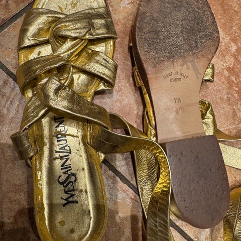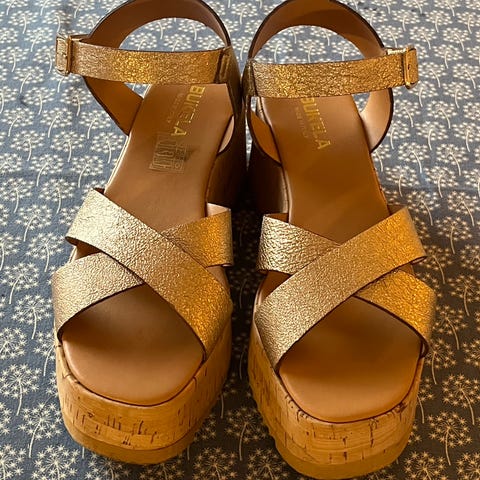 Vakre festsko i gull. Kjøpt til bryllup og kun brukt noen ganger. Er veldig gode å ha på, men jeg trives bedre i lave hæler