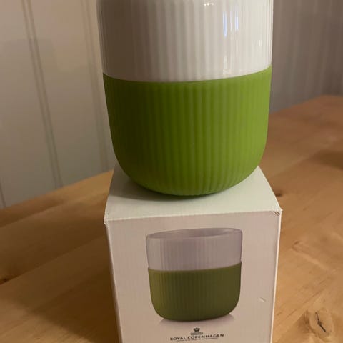 Porselenskrus med rillet struktur og silikonbånd i grønn / turkis farge for bedre grep og varmeisolering.