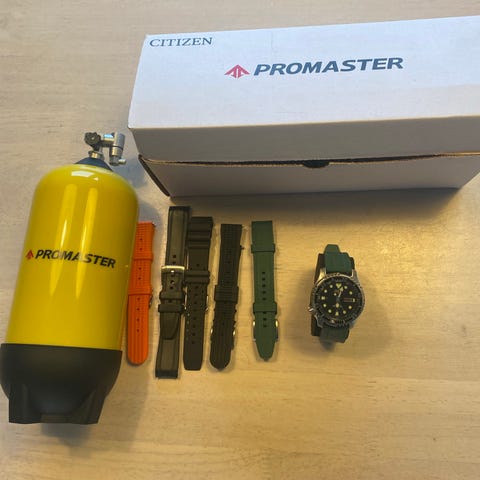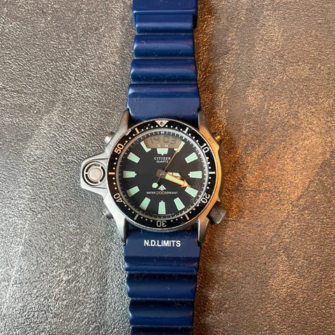 Citizen Promaster dykkerklokke for herre med blå urskive og blå gummirem. Klokken har roterende bezel i rødt og blått, tydelige selvlysende markører og visere, samt datovisning. Modellen er laget for dykking, med skrukrone og robust urkasse i metall. Passer som funksjonell dykkerklokke eller som hverdagsklokke med sporty uttrykk.