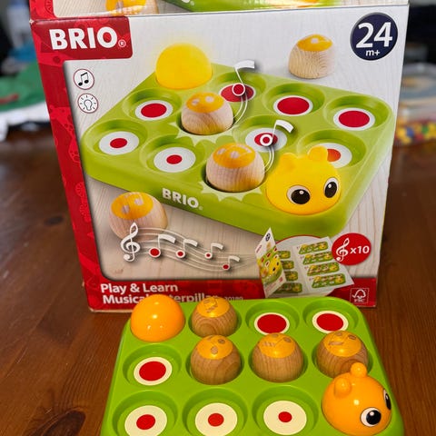 Liten samling med retro/vintage treleker. Draleke formet som And, babymobil /uro og trekkvogn fra Brio.
