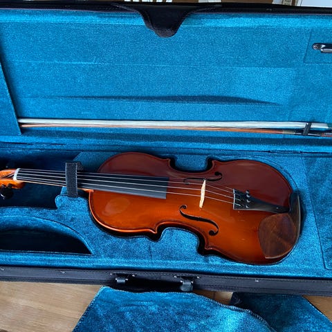Instrumentet har klassisk treverk med lakkert overflate. Fiolinen egner seg til øving og spilling for elever eller hobbybrukere. På bildene vises også bue, etui og tilbehør som kan følge medt.