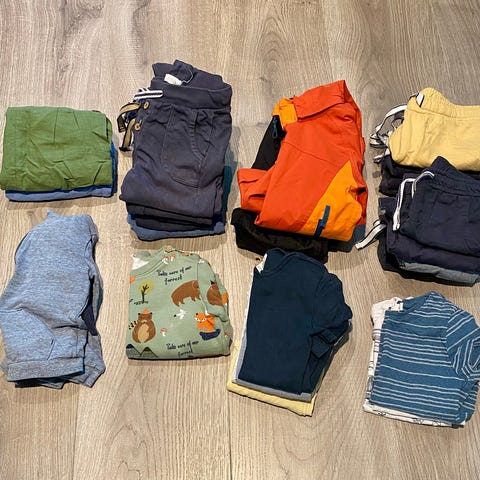 Selges billig - da det er tøymykner lukt på klærne. Ellers hele og fine klær.