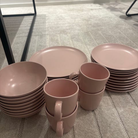 IKEA servise med rosa tallerkener og boller. Bildene viser et sett med dype og flate tallerkener i rosa keramikk eller steingods, samt noen boller i glass. Serviset passer til bruk i kjøkken og spisestue til hverdags og enklere selskaper. Antall deler og eksakte mål fremgår ikke av annonsen og kan eventuelt avklares med selger.