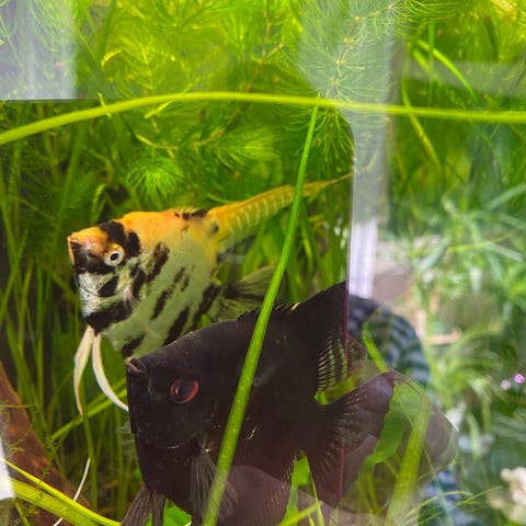Selger en nydelig Black Scalare (Pterophyllum scalare – svart variant). Kan få oransje etterhvert pga far er red devil scalare