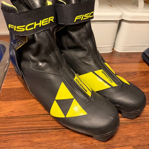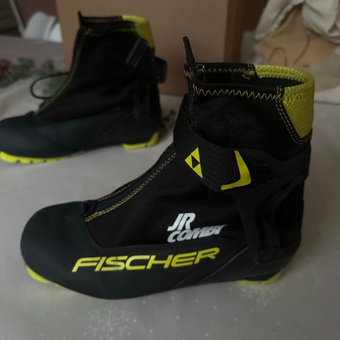 Fischer JR Combi langrennsstøvler i svart og gul farge i størrelse EU 41. Støvlene har høy ankelstøtte med plasthelkappe og borrelåslukking øverst. Glidelås foran beskytter snøringen og bidrar til å holde snø ute. Yttersålen er utformet for kombibruk klassisk/skøyting. Egnet som juniorsko til langrennstrening og turbruk.