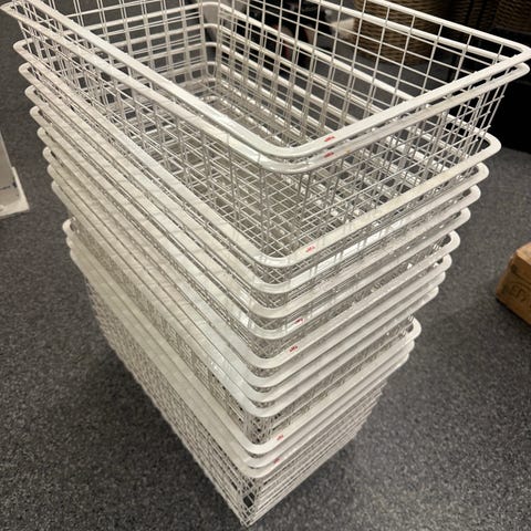 Elfa trådkurver i hvitlakkert metall. Kurvene er åpne nettingkurver som passer til Elfa-stativ og -skinner for oppbevaring. Egnet til oppbevaring av klær, tekstiler eller andre gjenstander i garderobe, bod eller vaskerom. Flere kurver i samme størrelse vist på bildene.