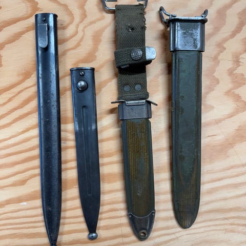 Helt ubrukte bajonetter i strøken stand. To leveres med slire i treverk, én med metallslire.