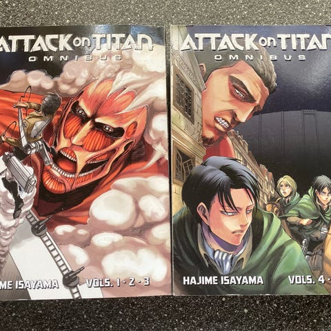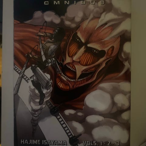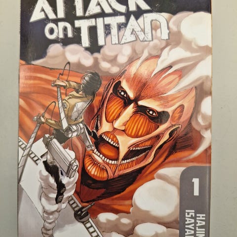 Hajime Isayama Attack on Titan Colossal Edition tegneseriebok. Samleutgave av manga-serien Attack on Titan i stort format. Boken inneholder flere kapitler samlet i én volumutgave, med illustrerte sider i svart-hvitt. Egnet for lesere som ønsker en større og mer omfattende utgave av serien.