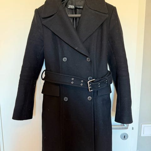 Kåpe fra Zara, m/belte og hette. Kåpen er grå. Den er lite brukt. Kjøpt for noen år siden i Spania. Kostet da kr 1400. Det var en merkelapp nederst på ermet hvor det stod:ull og 10%kasjmir. Denne ble fjernet da jeg tok den i bruk.