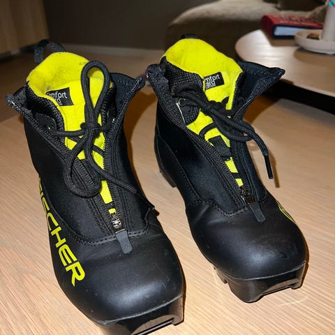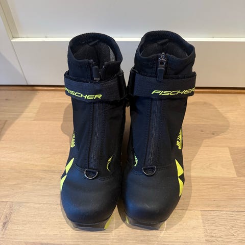 Fischer langrennsstøvler i svart med gule detaljer. Støvlene har snøring med glidelåslukking over vristen og yttersåle tilpasset moderne langrennsbindinger. Egnet til bruk på langrennski for trening og tur. Materiale ser ut til å være en kombinasjon av syntetiske materialer og tekstil for støtte og komfort rundt fot og ankel. Litt små i str.