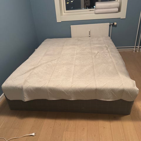 IKEA 140 rammemadrass med overmadrass, eikeben og madrassbeskytter selges. Fin stand på alt. Sengen har rette linjer og står på lyse treben. Nøytral farge gjør den lett å kombinere med ulik innredning og sengetøy.