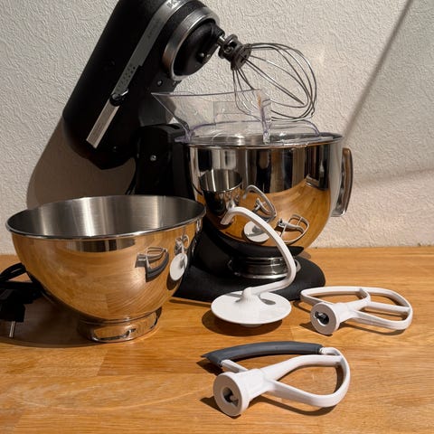 KitchenAid kjøkkenmaskin i krem med rustfri stålbolle. Maskinen kommer med ballongvisp, deigkrok og flatvisp, samt sprutbeskytter.