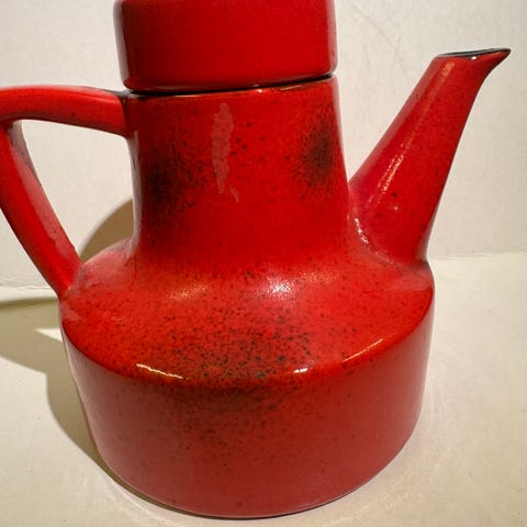 Dette er den såkalte «Fossil»-modellen, trolig designet av Bodo Mans. Dekoren består av relieffaktige, konsentriske sirkler i oransje og rødt mot en lys bakgrunn med brune nyanser, som gir et markant og nesten organisk uttrykk.