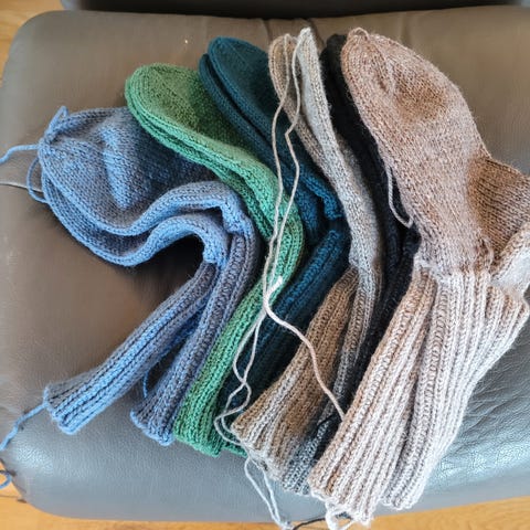 Håndstrikkede ullsokker i flere ulike flerfargede mønstre. Sokker med ribbestrikket skaft og glattstrikket fot. Passer til hverdagsbruk innendørs eller i støvler og sko. Flere fargekombinasjoner i blå, rosa, brune og grå toner. Materiale er ullgarn eller ullblanding, egnet for kjølige dager. Strikket etter mormors sitt gode gamle mønster. Med rund tupp. Rosa sokker str 36-38. De andre str 39-40.