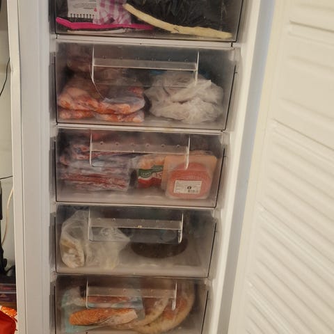 Fryseren har 3 skuffer, men nederste mangler (ble dessverre igjen i kjeller ved tidligere bosted og har ikke vært mulig å hente).