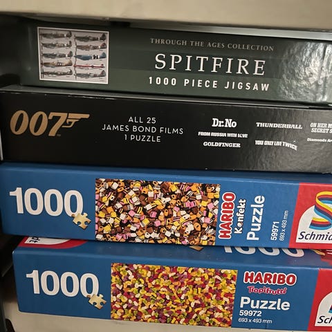 Puslespill med motiv av en kystby med hus, båter og sjø i sterke, flerfargede toner. Bildet viser bygninger langs vannkanten, småbåter i forgrunnen og en fargerik himmel. Egnet som puslespill for voksne eller større barn og som dekorativt bilde når det er ferdig lagt. Ta kontakt for Antall brikker og mål på puslespillet