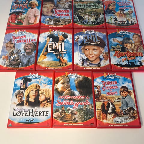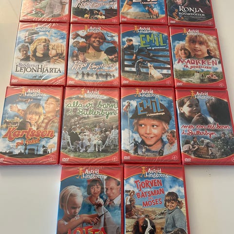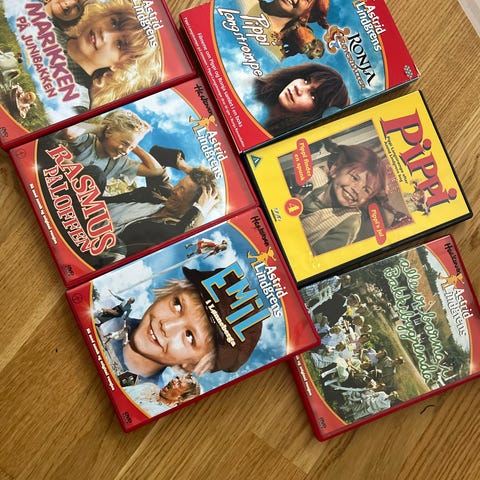 Svart pippi pengeveske med 24 Astrid Lindgren filmer. De fleste filmene er pakket inni plast og uåpnet. Kjøpt i Vimmerby i Sverige. Masse koselige og nostalgiske filmer selges ;)