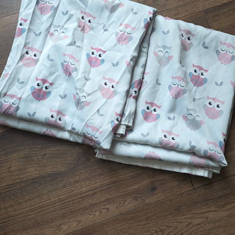 Rosa/lyselilla farge med uglemotiv.