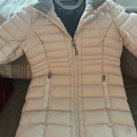 Marc O'Polo dunjakke for dame i størrelse 42 som tilsvarer L. Jeg bruker M til vanlig så vil si størrelsen er fleksibel. Lang modell med hette og gjennomgående glidelås foran og glidelås på sidene for bedre bevegelse eller når man sitter i bil. Jakken er fylt med dun, og føles lett på. Stropper som gjør at man kan henge den på ryggen om man vil. Jakken er lite og pent brukt.
