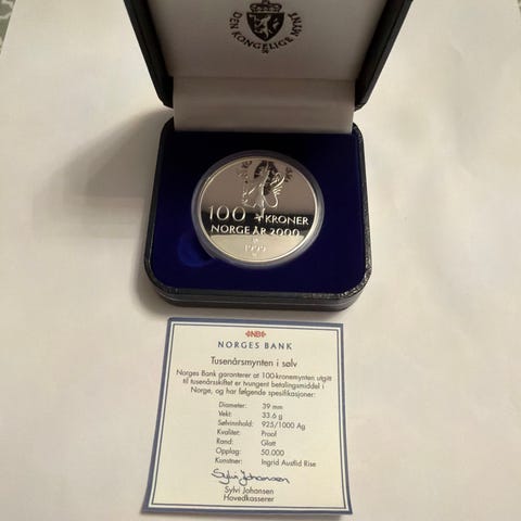 Norges Bank 100-kroner minnemynt i sølv utgitt i forbindelse med «Norge år 2000». Mynten har årstall 1999 og pålydende verdi 100 kroner. Leveres i etui, som vist på bildene. Egner seg som samleobjekt for mynter og numismatikk.