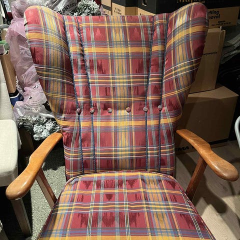Unik ørelappstol med krakk og sidebord
