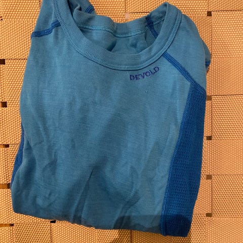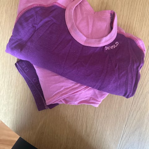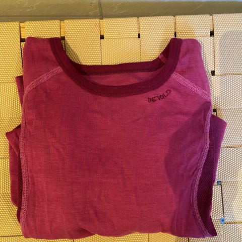 Devold Multi Sport, overdel i pen rosa/lilla farge. Fra en eldre kolleksjon. Lite brukt. Ligget i en skuff de siste åra. Den er veldig elastisk. Jeg er L/XL og har brukt den som innerste tettsittende lag.