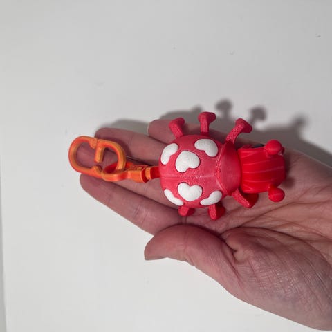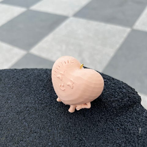 Ukjent merke figur nøkkelring i beige farge. Nøkkelringen har en liten figur med runde former, markerte øyne og røde lepper. Den har oppheng i toppen som gjør at den kan festes til nøkler, veske eller ryggsekk. Materialet ser ut til å være plast eller gummiaktig materiale. Passer som pynt eller tilbehør.