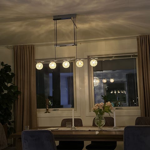 Skeidar pendellampe i kuleformet design, laget i metall med runde glassdetaljer. Lampen består av flere kuler montert på en avlang skinne, med oppheng i metall. Gir et dekorativt lysspill i tak og omgivelser. Passer over spisebord, i stue eller andre oppholdsrom der det er behov for både belysning og et markert designelement. Designet av Achille Castiglioni.