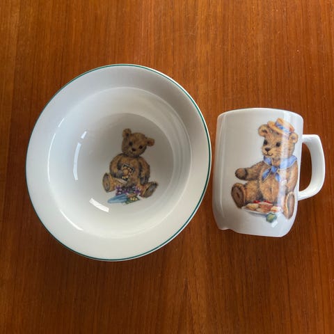 Barneservise med kopp og skål i porselen selges.