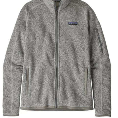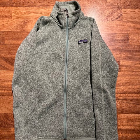 Patagonia jakke for dame i størrelse L. Jakken er grå og laget i polyester med myk, pelslignende innside. Den har hette, hel glidelås foran og sidelommer. Passer som hverdagsjakke eller mellomlag på kjølige dager.