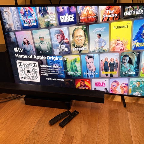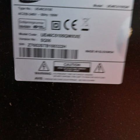 TV med tilhørende lydplanke. TV-en står på TV-benk og har en tynn ramme. Lydplanken er plassert foran TV-en. Egnet for vanlig TV-bruk og filmvisning i stue eller tilsvarende rom. Merke, modell, størrelse og andre spesifikasjoner er ikke oppgitt.